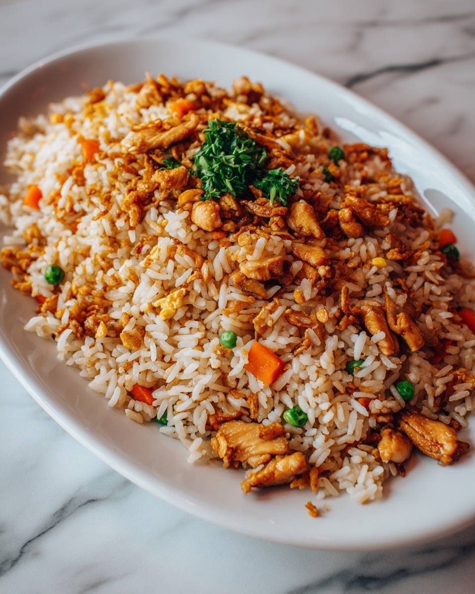 For an eye-catching presentation, serve the BBQ Chicken Fried Rice Recipe in individual cast-iron skillets or mini rice bowls. You could also turn it into a stuffed pepper by filling roasted bell peppers with the fried rice mixture and baking briefly before serving, adding a delightful spin and an extra vegetable boost.
