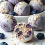 These bites are perfect served cold or at room temperature, but if you’d like a slightly softer texture, simply leave them out for a few minutes or warm them gently in your hand. Avoid microwaving as they might lose their delicate texture and fresh blueberry flavor.
