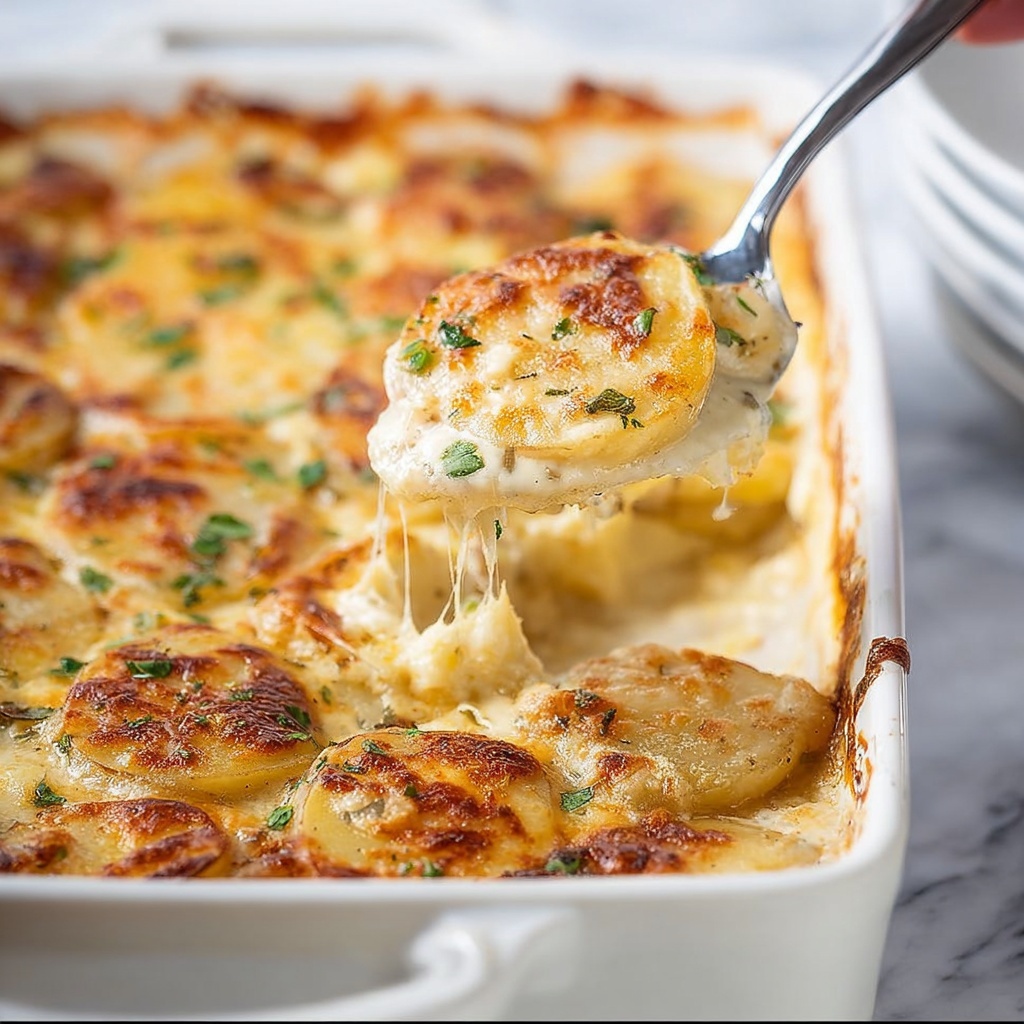 Creamy, cheesy, and garlicky scalloped potatoes made with thinly sliced Yukon gold or russet potatoes baked in a rich cheddar and Parmesan cheese sauce. This classic American side dish is perfect for holidays or family dinners, with layers of tender potatoes and a golden bubbly top.