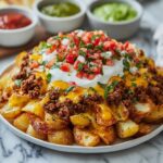 Cheesy Taco Potatoes are a delicious and comforting dish combining crispy roasted russet potatoes with savory, seasoned ground beef, and melted cheddar and Monterey Jack cheeses. Finished with fresh toppings like sour cream, cilantro, tomatoes, and optional olives and jalapeños, this recipe is perfect for a flavorful weeknight dinner or a satisfying game day snack.
