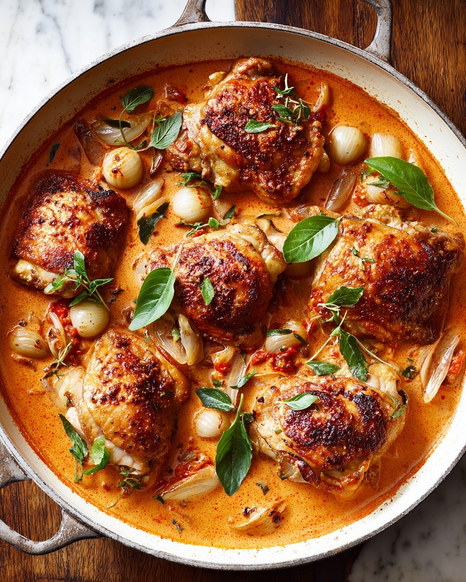 Start by preheating your oven to 375°F (190°C). Season the chicken thighs generously with salt, black pepper, and smoked paprika to build a flavor foundation. Heat olive oil in a large ovenproof skillet over medium-high heat and sear the chicken for about 3 to 4 minutes on each side until golden and slightly crispy. This step locks in juices and creates a beautiful color. Once seared, transfer the chicken to a plate to rest while you create the sauce.