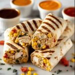 This Chicken Burritos recipe features tender, flavorful chicken seasoned with a blend of chili powder, cumin, and smoked paprika, combined with sautéed vegetables and refried beans. Wrapped in warm flour tortillas with Mexican rice, corn, and melted cheddar cheese, these burritos are toasted to golden perfection and served with salsa, sour cream, and optional nacho cheese sauce for a delicious and hearty meal perfect for any occasion.