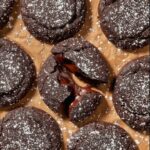 Allow the cookies to cool on the baking sheet for a few minutes, then transfer them to a wire rack to finish cooling. Once room temperature, sprinkle with powdered sugar to mimic the look of a molten lava cake, adding a delicate, snowy finish that’s as charming as it is delicious.