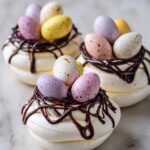 - Fill and decorate: Once the meringue nests are completely cooled, fill the centers with whipped cream or chocolate ganache. Garnish with candy eggs or chocolate eggs and optionally sprinkle shredded coconut or colorful sprinkles over the top for an extra festive touch.