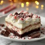 Chocolate Peppermint Lasagna is a festive, no-bake dessert featuring layers of chocolate cookie crust, creamy peppermint filling, rich chocolate pudding, and whipped topping, garnished with crushed candy canes and chocolate shavings. It’s a perfect treat for holiday gatherings, offering a delightful combination of chocolate and peppermint flavors in a simple, make-ahead dish.