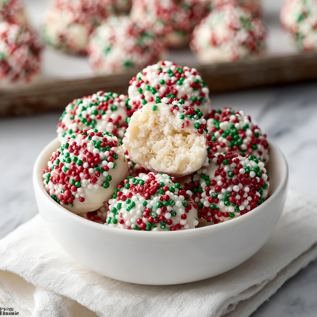 Melt your white chocolate wafers gently in a microwave or double boiler until smooth. Next, dip each chilled truffle using a fork, covering them entirely in the glossy white chocolate. Return the coated truffles to your baking sheet and quickly sprinkle them with your chosen festive decorations before the chocolate sets.