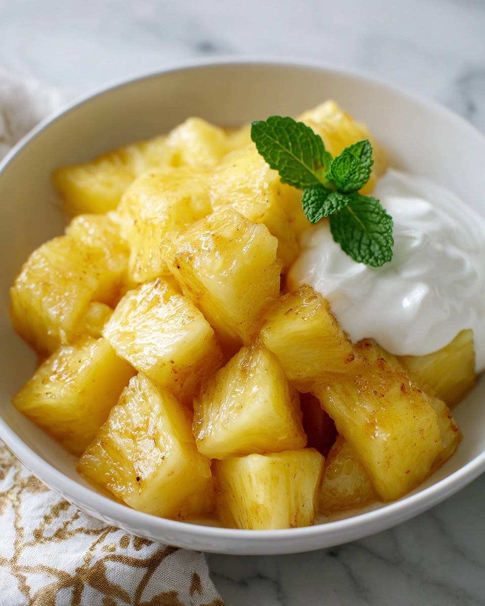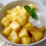 Sprinkle freshly chopped mint or toasted coconut flakes on top of your warm cinnamon fried pineapple for an extra burst of color and texture. A dollop of whipped cream or a scoop of creamy vanilla ice cream can also elevate the dish into an irresistible dessert.