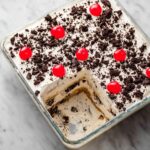 When you’re ready to serve, it’s time for the showstopper: the whipped cream. Chill your mixing bowl briefly in the freezer to help the cream whip up to fluffy perfection quickly. Beat the heavy whipping cream with powdered sugar and vanilla extract at high speed until soft peaks form. Then fold in the crushed Oreos to infuse the topping with that irresistible cookies and cream flavor. Spread this cloud-like topping evenly over the chilled cake and adorn each slice with a bright red cherry for a festive touch.