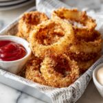 For a fun party snack, serve your crispy onion rings stacked in a tall glass or cone lined with parchment paper for a shareable treat. Another idea is to build a loaded onion ring tower topped with a variety of dipping sauces served family-style—guaranteed to impress your guests!