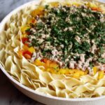 3. Layer the crockpot: In your crockpot, start by adding half of the cooked pasta as the base layer. Follow this with half of the browned beef and vegetable mixture evenly spread over the pasta.