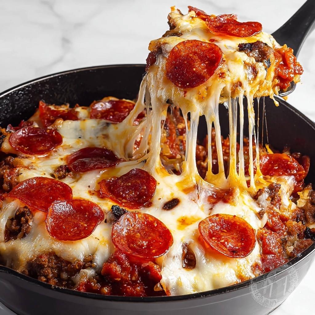 Grab a greased 9-inch baking dish and spread the savory meat and veggie mixture evenly across the bottom. Carefully spoon the pizza sauce over the top in a smooth layer. Now comes the fun part — sprinkle the shredded mozzarella and grated Parmesan cheese generously over the sauce, creating a luscious, melty top. If you want to add some extra pizzazz, spread sliced black olives and pepperoni slices evenly on top for that classic pizza finish.