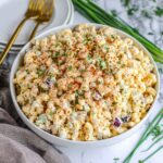 Finish off your Deviled Egg Macaroni Salad Recipe by sprinkling it with more smoked paprika and a generous handful of freshly chopped chives. Not only do these garnishes add an attractive hint of color, but they also enhance the smoky and fresh notes of the dish just beautifully. Now you’re ready to enjoy a salad that’s as stunning as it is delicious.