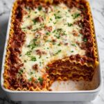 This Easy Meat Lasagna is a classic Italian-American favorite that combines layers of tender lasagna noodles, rich meat sauce made from ground beef and Italian sausage, creamy ricotta cheese mixture, and gooey mozzarella cheese. Perfectly seasoned with Italian herbs and spices, this comforting dish is baked to bubbly perfection and garnished with fresh parsley for a delicious family meal.