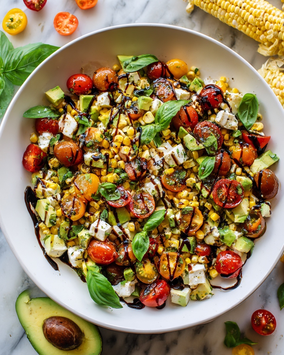 A refreshing and vibrant Fresh Corn and Tomato Caprese Salad combining the sweetness of fresh corn and cherry tomatoes with creamy mozzarella and fragrant basil, drizzled with olive oil and balsamic glaze for a perfect summer side or light lunch.