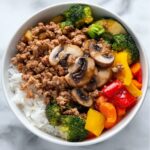 A wholesome and flavorful Ground Turkey Roasted Veggie Rice Bowl featuring tender roasted vegetables, savory ground turkey simmered with soy sauce, all served on a bed of warm rice. This Asian-inspired dish is perfect for healthy meal prep, packed with protein and vibrant veggies, and offers flexibility with gluten-free and low-carb options.