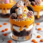 This Halloween trifle is a festive layered dessert featuring moist chocolate cake, creamy orange-tinted vanilla pudding, and fluffy Cool Whip, decorated with spooky candy accents like gummy body parts and chocolate eyeballs. Perfect for holiday parties, it combines easy-to-make components into an eye-catching, delicious treat.