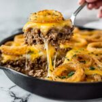 Hobo Casserole is a comforting, hearty baked dish featuring layers of seasoned ground beef, thinly sliced potatoes, melted Colby Jack cheese, and a creamy soup mixture. Topped with crispy fried onions and fresh herbs, this easy-to-make casserole is perfect for family dinners or potlucks.