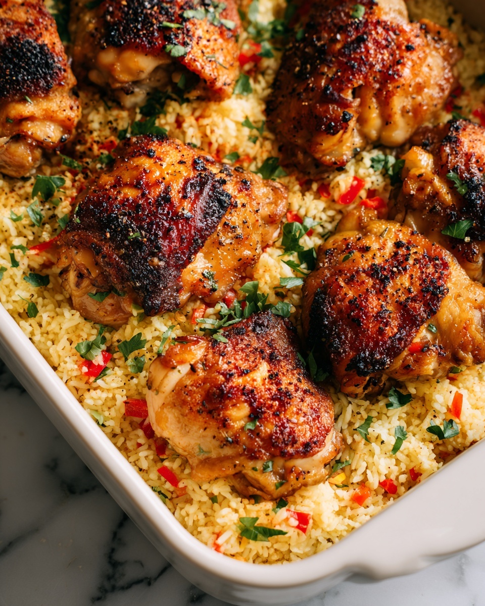 A hearty and flavorful Italian Chicken Rice Casserole combining tender bone-in chicken thighs with aromatic garlic, onions, and bell peppers, baked together with white rice, diced tomatoes, and topped with melted mozzarella cheese for a comforting one-pan meal.