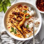 Lemongrass Broth Bowls with Yellow Curry Chicken is a fragrant and comforting dish featuring tender chicken thighs coated in vibrant yellow curry paste, served over fluffy rice and immersed in a savory lemongrass and coconut milk broth. Topped with fresh mint, chili crisp, and crispy shallots, this bowl combines fragrant Southeast Asian flavors with a balanced and hearty meal perfect for any day of the week.