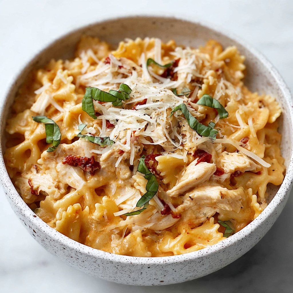 Gradually whisk in the heavy cream, bringing the sauce to a gentle bubble. Add chopped sun-dried tomatoes for that tangy chew, dried oregano for an earthy hint, and crushed red pepper flakes for a subtle kick. Toss in the shredded chicken, folding it into the sauce to warm through and absorb all those luscious flavors. Let the sauce thicken, stirring occasionally, until it reaches a creamy, rich consistency that will coat your pasta perfectly.