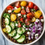 A refreshing and healthy Mediterranean Lentil Salad combining tender cooked lentils with fresh vegetables, Kalamata olives, and tangy feta cheese, dressed in a zesty lemon-oregano vinaigrette. This quick and easy salad is perfect as a light lunch or a flavorful side dish.