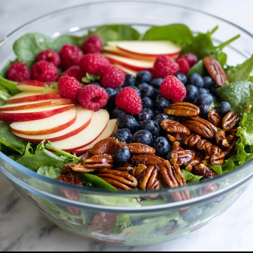 - Assemble the Salad: In a large mixing bowl, add the mixed greens. Layer the strawberries, blueberries, raspberries, diced red onion, chopped apple, candied pecans, and feta cheese crumbles on top. Reserve a small amount of each topping to sprinkle on at the end for a professional and attractive presentation.