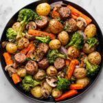 Sausage slices are done when they’re nicely browned on the outside and no longer pink in the center. Roasting them alongside the veggies at 400°F usually ensures they cook through in 30 minutes.