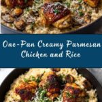 This One-Pan Creamy Parmesan Chicken & Rice is a delicious and comforting meal that combines tender chicken breasts seared to perfection with a creamy, cheesy rice cooked all together in one skillet. Perfect for a hassle-free weeknight dinner, this dish features savory garlic and paprika-seasoned chicken nestled into rich Parmesan-infused rice, simmered to creamy tenderness and garnished with fresh parsley for a burst of color and flavor.