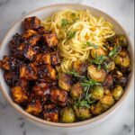 This Pan-Fried Sticky Garlic Tofu with Oven-Roasted Brussels Sprouts is a flavorful vegan main course featuring crispy pan-fried tofu coated in a sticky garlic soy glaze, paired with perfectly roasted Brussels sprouts that are golden and tender. The dish combines savory, sweet, and slightly spicy elements for a satisfying and nutritious meal.
