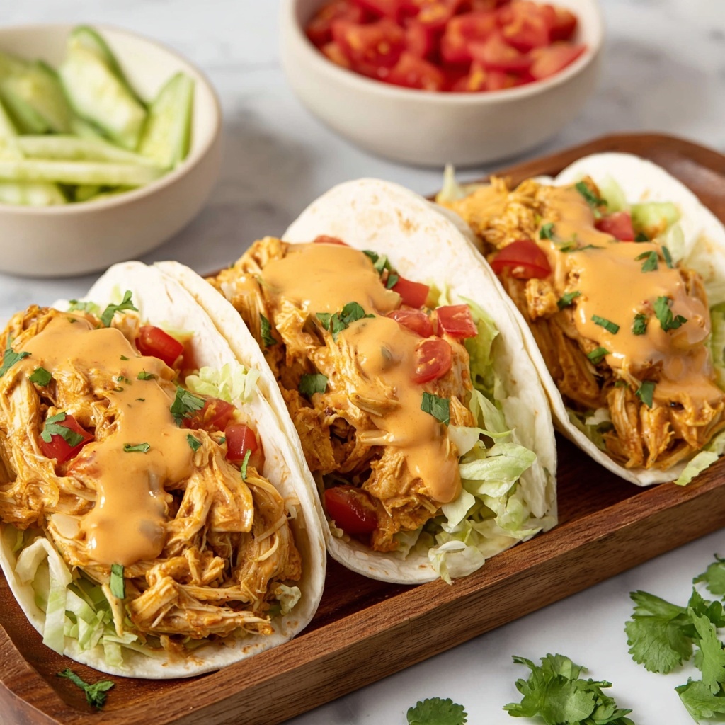 Fresh garnishes really elevate this Queso Chicken Tacos Recipe from good to unforgettable. Crisp shredded lettuce adds crunch, juicy diced tomatoes bring acidity, and creamy avocado slices provide a cool counterbalance to the smoky taco seasoning. If you like a little heat, sliced jalapeños or a drizzle of hot sauce are fantastic finishing touches that bring the whole taco alive.