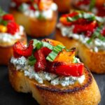 Delightful roasted red pepper and feta bruschetta that combines the smoky sweetness of red peppers with creamy feta cheese on toasted baguette slices. Perfect as a Mediterranean-inspired appetizer or snack, this easy-to-make recipe requires minimal prep and bakes quickly to create a crispy, flavorful bite.