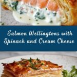 - Assemble the Wellingtons: On a lightly floured surface, roll out puff pastry sheets and cut into rectangles large enough to wrap each salmon fillet completely. Spoon the spinach and cream cheese filling into the center of each pastry piece. Place a salmon fillet on top of the filling. Fold the pastry edges over the salmon, sealing the seams with water or beaten egg.