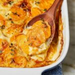 This delicious Scalloped Sweet Potatoes recipe features thinly sliced sweet potatoes baked in a creamy garlic-infused heavy cream sauce, topped with melted Gruyere and Parmesan cheese for a rich, golden, and bubbly finish. Perfect as a comforting side dish for any meal.