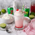 - Garnish and serve: Add a dollop of whipped topping on top, then garnish with a maraschino cherry, a lime wedge, and a sprinkle of pink sanding sugar if desired. Serve immediately and enjoy the playful, fizzy treat.