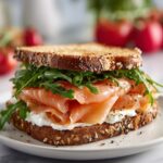 A delicious and easy-to-make smoked salmon sandwich featuring creamy cream cheese, tangy Dijon mustard, briny capers, and fresh herbs on whole grain or rye bread. Perfect for a quick lunch or light dinner with a burst of savory and fresh flavors.