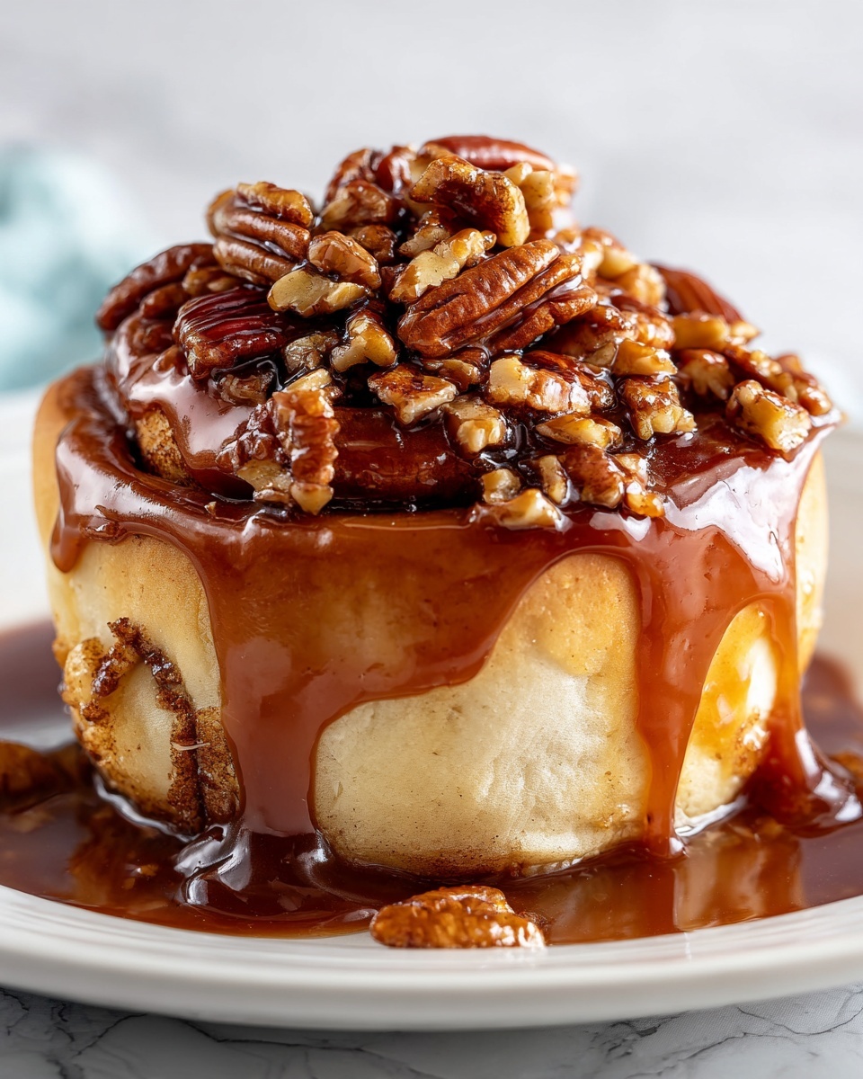 Try serving individual rolls in small ramekins topped with a scoop of vanilla ice cream for a dessert twist. Alternatively, place them on a rustic wooden platter with extra pecans and cinnamon sticks for a cozy, inviting centerpiece that’s sure to wow guests at your next gathering.