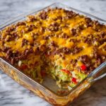 A hearty and comforting Southern Style Cabbage Beef Bake combining ground beef, fresh cabbage, and savory spices baked under a bubbly layer of melted cheddar cheese. This casserole is perfect for a satisfying family dinner with classic Southern flavors.