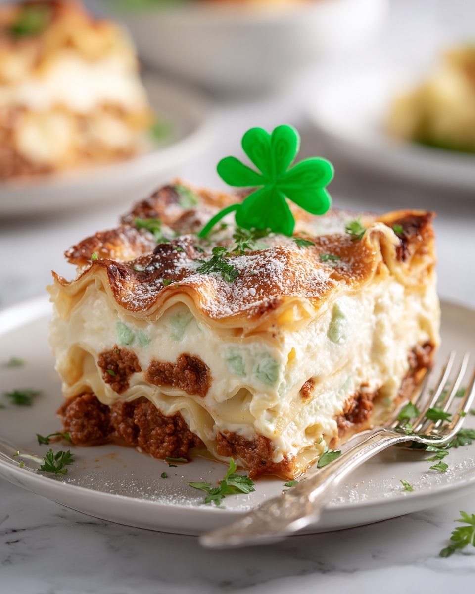 Right before you’re ready to serve, adorn your shamrock lasagna dessert with some freshly whipped cream or sprinkle some mint leaves on top to add an elegant, fresh touch that ties everything together wonderfully.