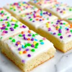 - Frost the bars: Spread the vanilla bean frosting evenly over the cooled sugar cookie bars. Optionally, sprinkle with colorful sprinkles for decoration.